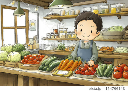 新鮮な野菜を扱う青果店スタッフの仕事風景