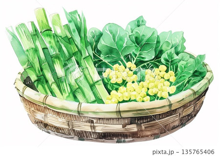 水彩風 早春の山菜 竹ざるの上のうど