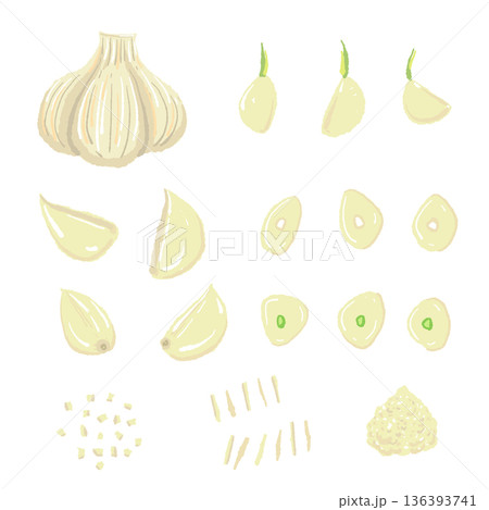 白にんにく 半分に割った断面・一片など 筆タッチ手描きイラスト
