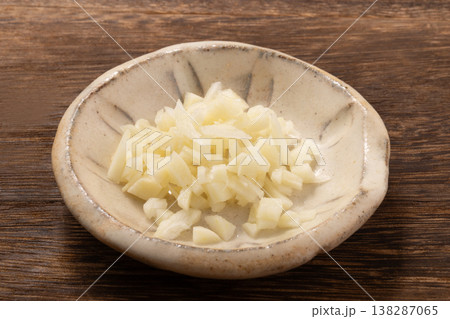 Close-up shot of minced garlic in wooden spoon placed on wooden chopping board In the kitchen prepared for food ingredients.