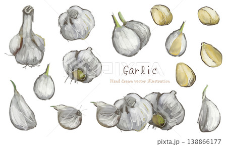 水彩で描いたニンニクの素材(ホールと欠片)のセット