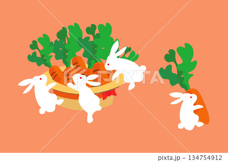 帽子の中に入った人参に興味津々の白い兎たちのイラスト