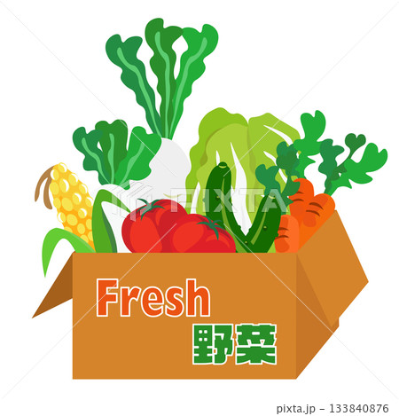 新鮮な野菜と書かれた段ボール箱にいっぱい詰まった野菜のイラスト