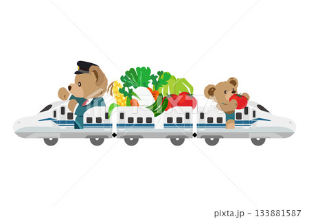 クマのぬいぐるみが、とれたて野菜を新幹線で運ぶイラスト