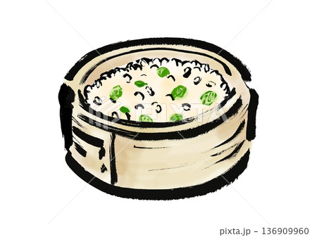 蒸篭に入っている豆おこわの和風筆イラスト素材