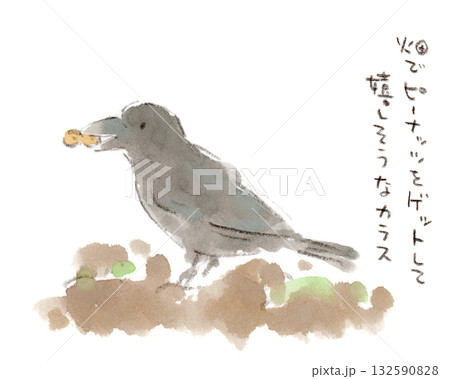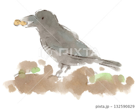 秋の風景、畑でピーナッツの残りを見つけて嬉しそうに咥えるカラスの水彩画イラスト