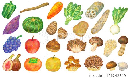 秋の食べ物のイラストセット オイルパステル画