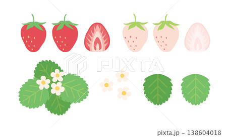 シンプルでかわいいイチゴの装飾イラストセット 白いちご 花と葉っぱ 苺の断面図 スライス