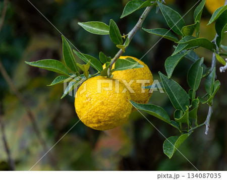 陽の光で黄色く輝く柚子の実 柚子の木 (11月)