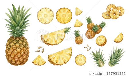 水彩風パイナップルのバリエーションと輪切りパインのイラストセット