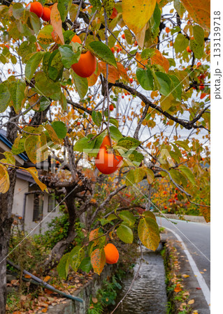 実りの秋の景色 樹上で熟れた美味しそうな柿