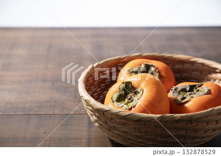 秋の味覚 笊に盛り付けた 柿 ( 木目背景 )柿の実 かき 果物