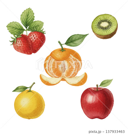 冬のフルーツ水彩イラストセット いちご・りんご・みかん・キウイ素材