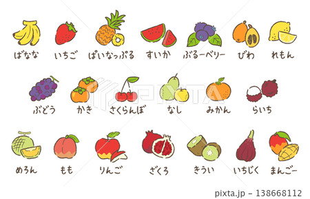 ひらがな果物イラストセット|手書きのかわいいフルーツと名前素材|知育・日本語学習