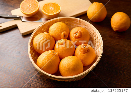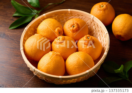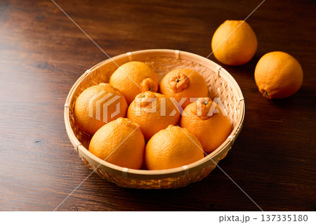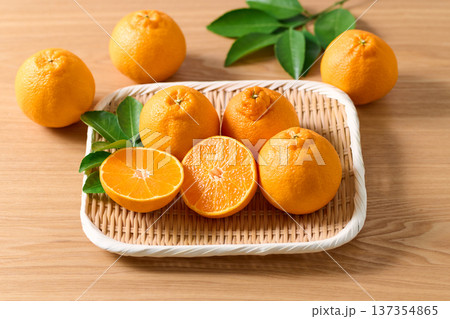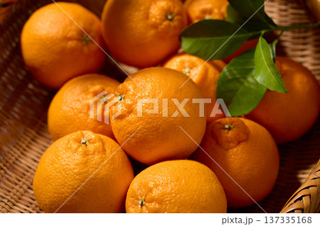 伊予柑 竹ざるに盛った国産柑橘類の果物素材