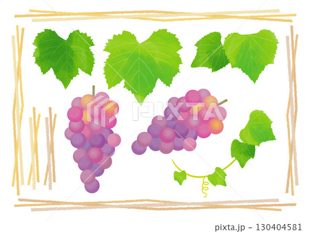 水彩で描いた葉と一房の葡萄のセットイラスト素材【手描き】白バック 切り抜き