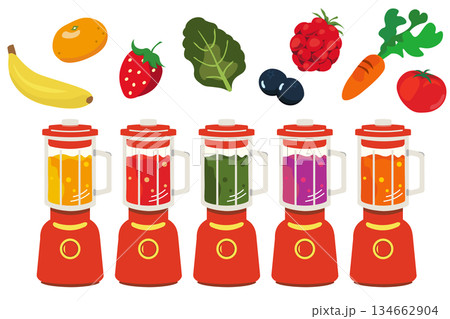 いろいろな野菜と果物と、ミキサーで作るスムージーのイラスト