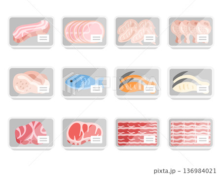 スーパーのパックに入った、鮮魚とお肉のアイコンのイラストセット
