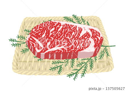 和牛ブロック肉と丸い竹ザルの盛り付けイラスト