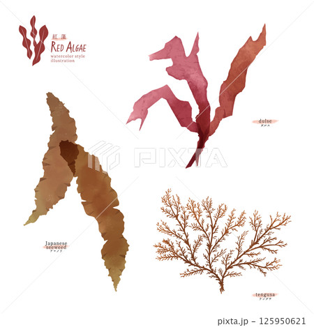 紅藻類の水彩イラスト(アマノリ・ダルス・テングサ)