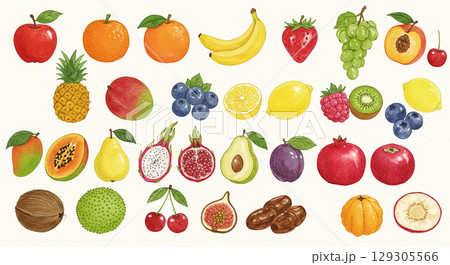 新鮮なフルーツ・果物のイラストセット 水彩風アイコン30種類詰め合わせ