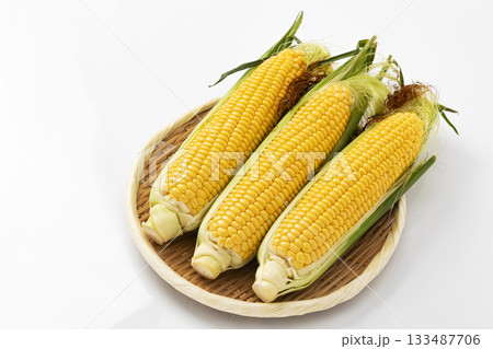 白バックでざるに乗せたひげ付きとうもろこし