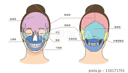 アジア人女性の顔の前面と後面の頭蓋骨イラストと名称