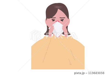 風邪をひいて鼻をかむ女性。ベクターイラスト
