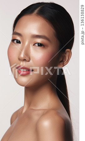 日本人女性のスキンケアポートレート:ポニーテールと透明感のある肌、両頬に手を添えるクローズアップ