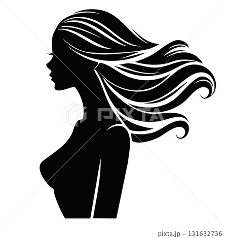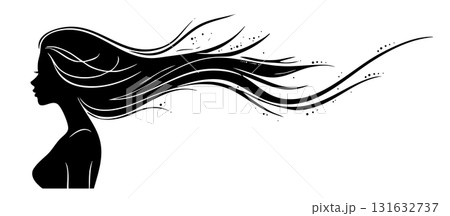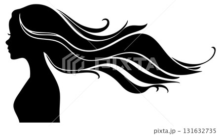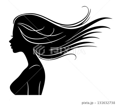 風になびく長髪がエレガントで美しい女性の横顔のシルエット
