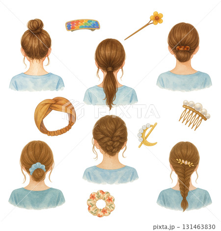 女性のまとめ髪 ヘアアクセ 切り抜き水彩イラスト