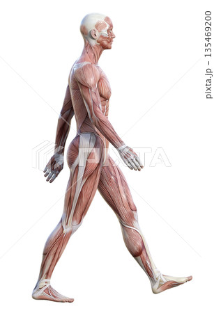 手を振って歩く筋肉解剖図 人体模型の男性の3Dイラスト 全身横向き