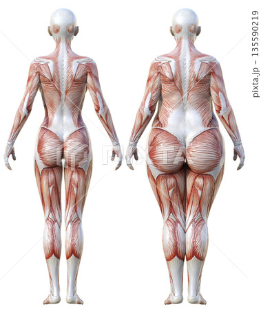 筋肉解剖図 太った女性の人体模型と痩せた女性の人体標本の比較イラストセット 全身後ろ姿