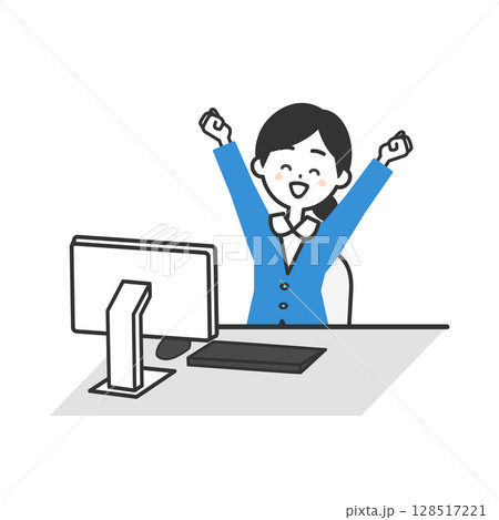 パソコンの前で笑顔で伸びをするスーツ姿の女性イラスト