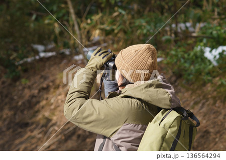 冬の野外で双眼鏡を持ち散策する女性