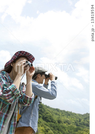 The Netherlands, Veluwezoom, Posbank, Woman in countryside looking through binoculars