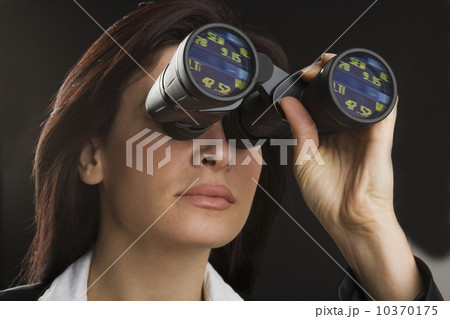 USA, New Jersey, Woman looking through binoculars in Autumn forest
