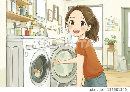 ドラム式洗濯機で洗濯をする女性の暮らし|やさしい日常と家事風景のイラスト