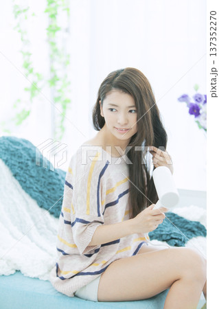 ヘアドライヤーでヘアブロー・髪の毛を乾かす女性(ヘアケア)