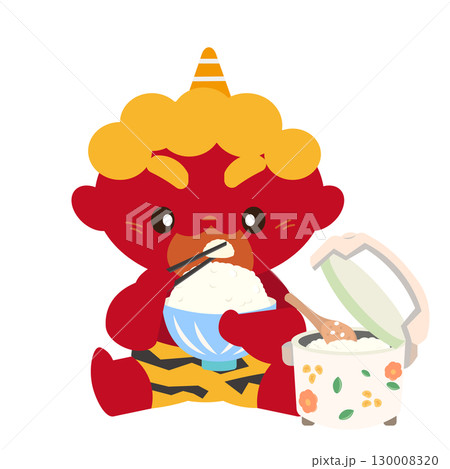 炊飯器で炊いたご飯をお茶碗によそって食べる赤鬼のイラスト