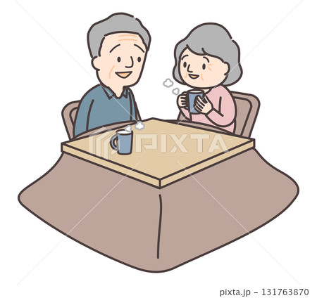 こたつに入りマグカップでコーヒーを飲むシニア夫婦