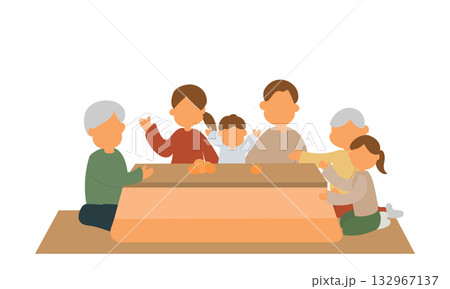 こたつでみかんを食べる三世代家族のイラスト