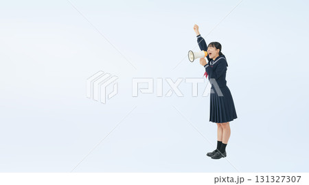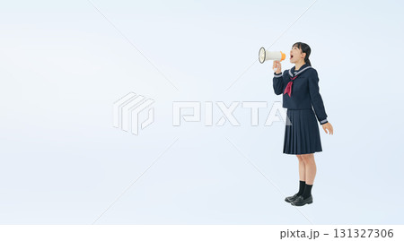 拡声器で叫ぶセーラー服を着た女子学生の切り抜き全身写真