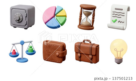 ビジネスと資産運用の3Dアイコン8種類セット、クレイ風イラスト素材