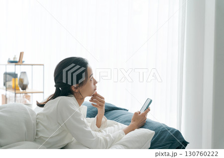 目覚まし時計を見て驚くびっくりする若いアジア人女性(寝坊,遅刻,寝過ごす)