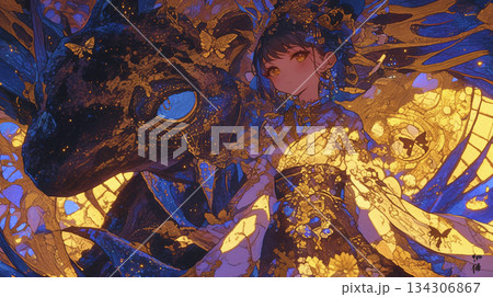 桜咲く湖岸 満月の夜にバイオリンを弾く女性