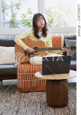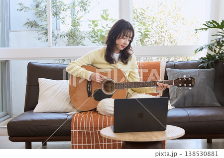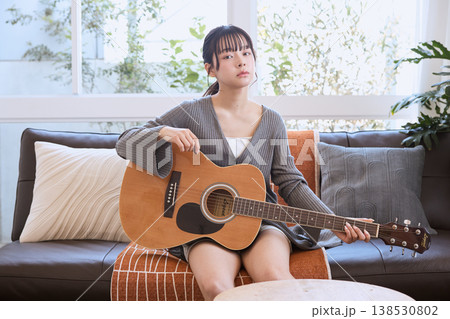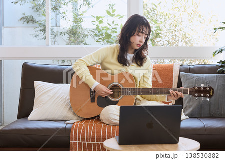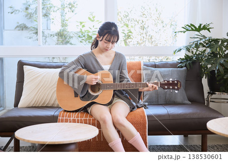 自宅でギターを練習する女性のライフスタイル