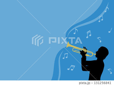 トランペットを吹く人物のシルエットと音符の横長なフレームのベクターイラスト