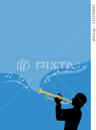 トランペットを吹く人物のシルエットと音符の縦長なフレームのベクターイラスト