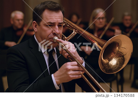 オーケストラでトロンボーンを演奏している男性